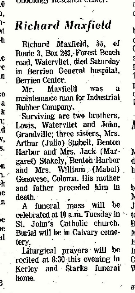 - d. at Berrien Center, Berrien County, on 25 January 1975 (SSDI; MI D), last residence Watervliet, Berrien County (for Richard's obituary see below)