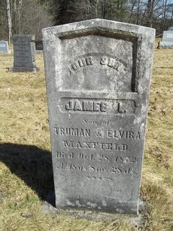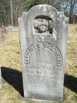 TRUMAN6 MAXFIELD (James5Richard4, Michael3, John2-1) was born at New Hampshire, about September 1821 a son of Jonathan Barnet Maxfield and his wife Mary Fellows. He died on 16 May 1880.[1] He married about 1843 CAROLINE ELVIRA BATCHELDER. She was born in the United States on 1 May 1822 and died on 2 March 1804.[2]