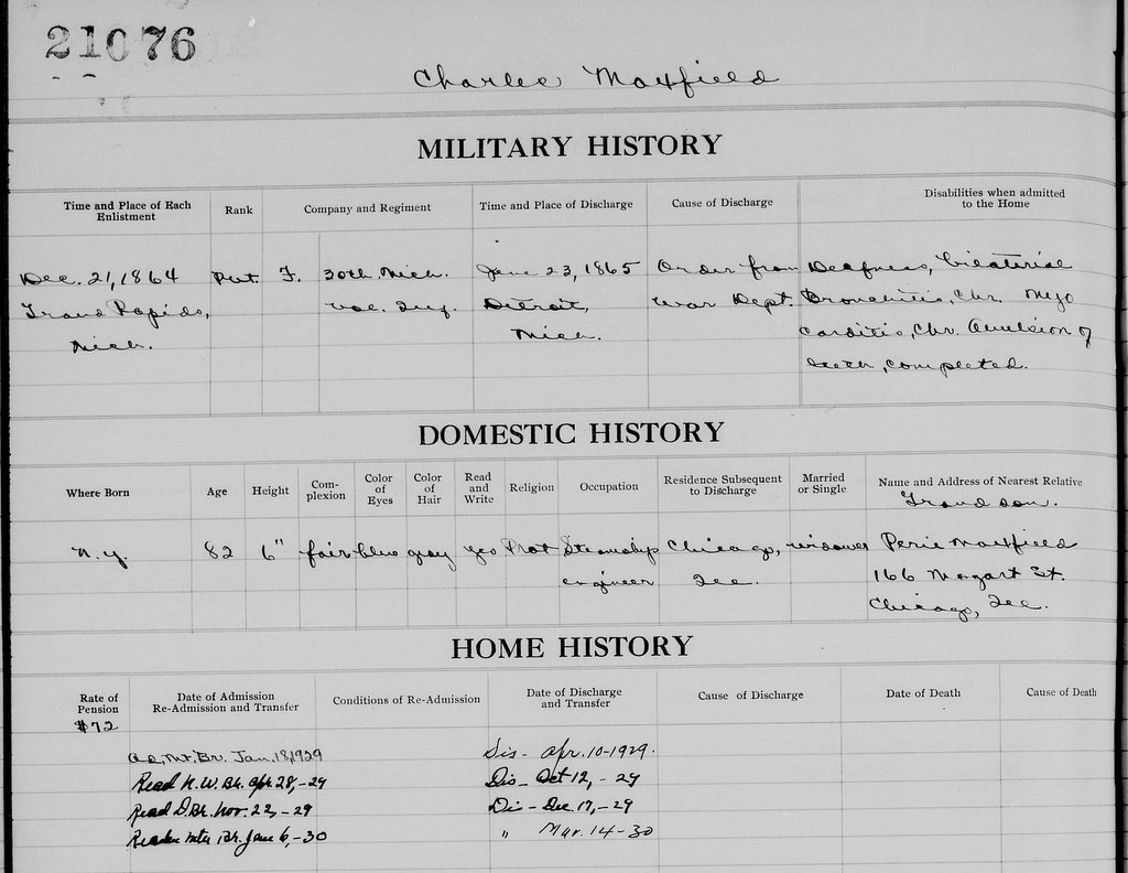 Fatine, or Faye, Maxfield died at Chicago, Illinois, on 19 April 1926 (IL D). Charles Maxfield resided at the National Home for Disabled Veterans intermittently from January 18, 1929 to June 6, 1930 (Disabl Sold). His record there follows:
