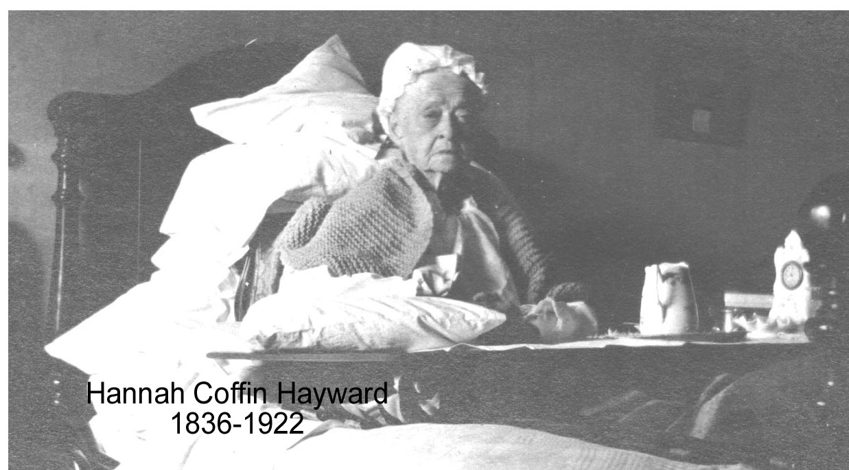 Hannah was born at Sidney, Maine (marriage record), in October 1836 (1900 Census), to Edmund and Almira Hayward. Hannah taught school for several years in Massachusetts and Maine, before marriage (Valentine).