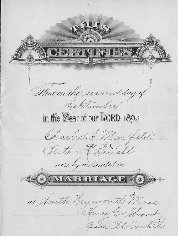 Maxfield, Charles A., Genealogical Collection, Lansdale, Pennsylvania. Certificate of Marriage, Charles A. Maxfield and Bertha H. Tirrell, 2 September 1895, Old South Church, South Weymouth, Massachusetts.
