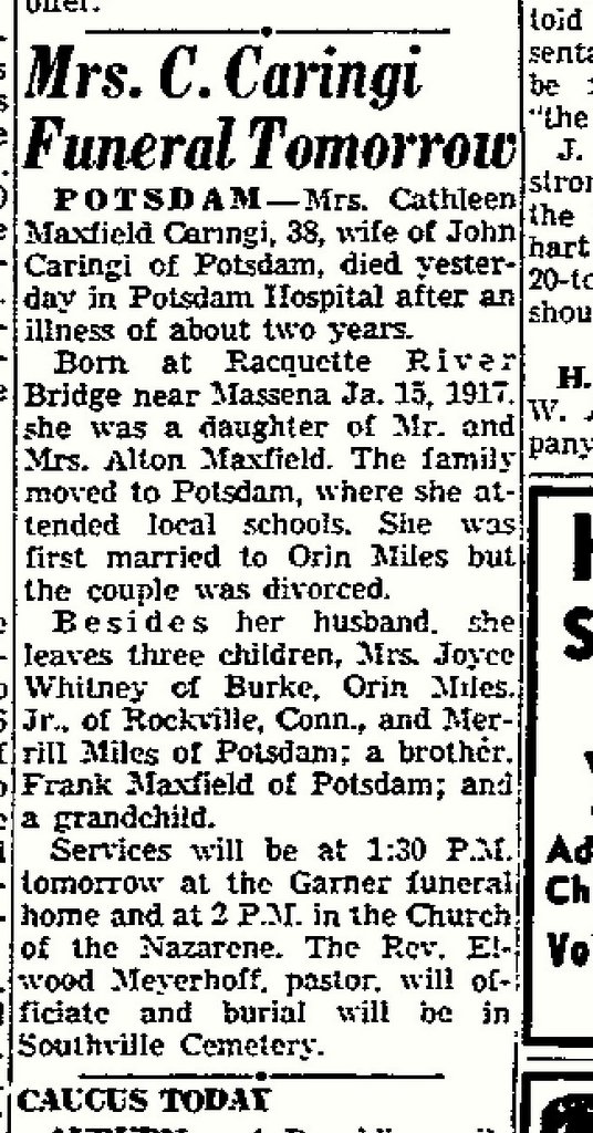 Obituary of Cathleen (Maxfield) (Miles) Caringi