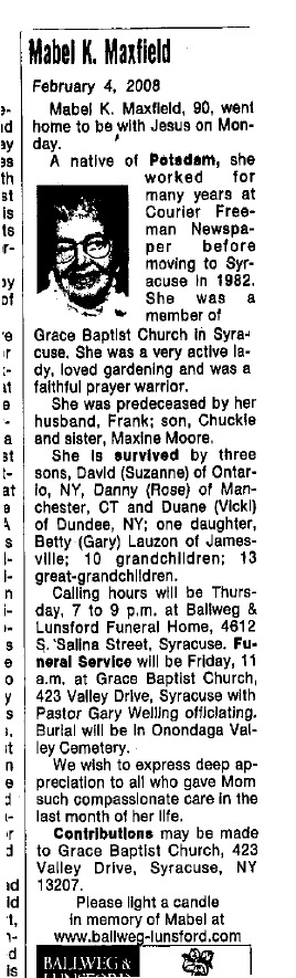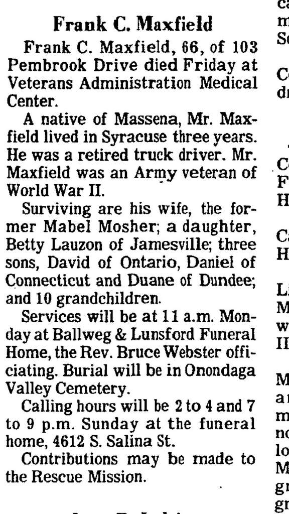 Frank Charles Maxfield died at Syracuse, New York, on 13 December 1985 (SSDI; Syracuse Herald, 14 Dec 1985, p. 4). Mabel Maxfield died at Syracuse on 4 February 2008. (Syracuse Post, 6 Feb 2008, p. 18)